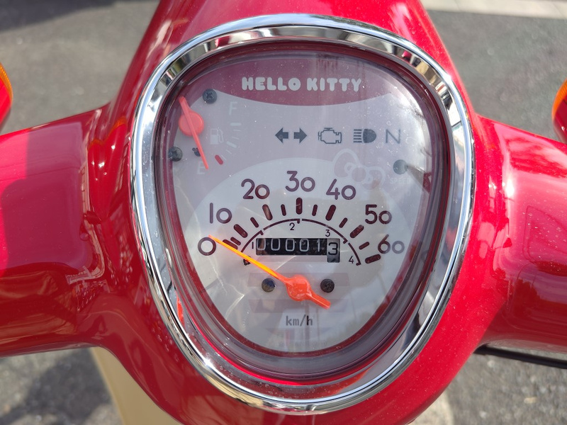 このモデルは、キティちゃんの可愛らしさが細部にまでちりばめられた、まさに特別な一台です。フロントににあしらわれたハローキティのリボンをモチーフにしたエンブレムや、サイドカウルにあしらわれたキティちゃんの顔のイラスト。メーター内にはハローキティのロゴがデザインされており、見るたびに心がときめきます。