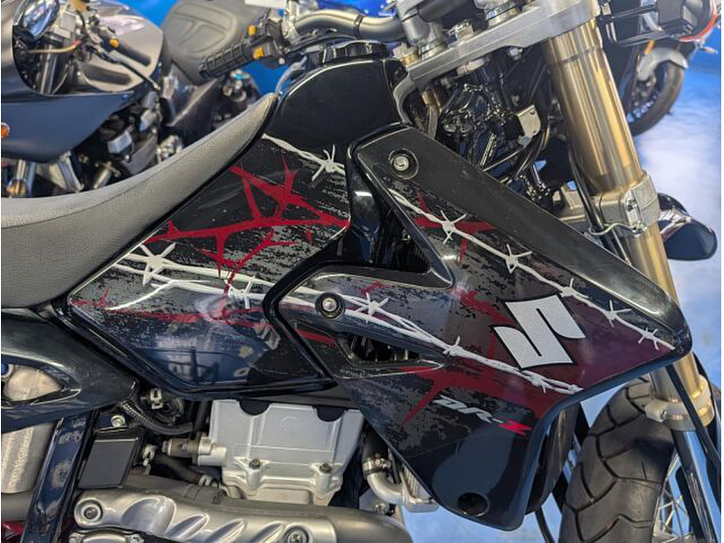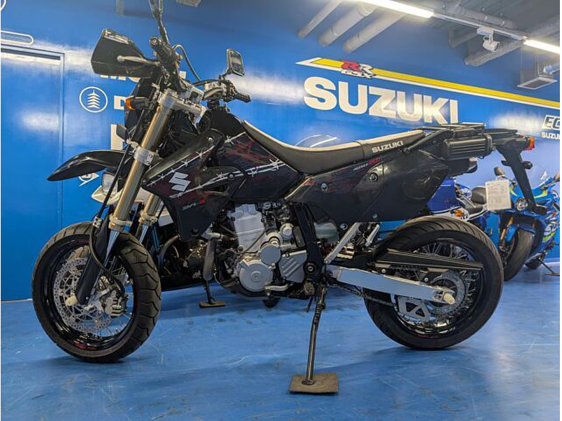 ETC、リアキャリア装着を装着した人気のモタードDR-Z400SM!!エンジン、足回り共にやる気にさせる走りはストリートからワインディングまで楽しませてくれる1台です!バーブワイヤー(有刺鉄線)を取り入れたアグレッシブなグラフィックも刺激的!MFD東京本店は新車はもちろん、中古車まで豊富な在庫ラインナップで皆様をお迎えいたします。
